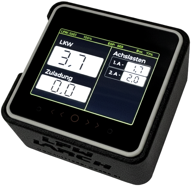 Das LFW-ESP-M5 Display ist ein mobiles Anzeigegerät zur drahtlosen Darstellung von Achs- und Gesamtgewichten bei Truck- und Trailer-Fahrzeugen (nur in Verbindung mit LFW-ESP-20 oder LFW-ESP-DIN).
